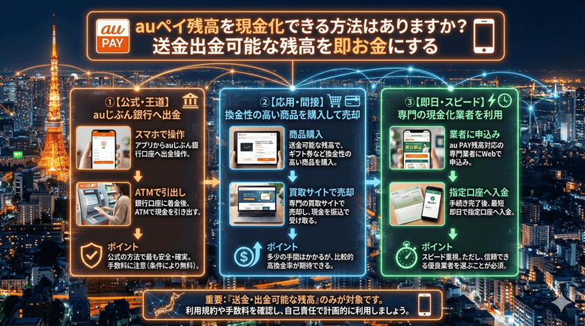 直接的な現金化はリスクが高すぎます。しかし、auペイ残高を工夫して使うことで、間接的に「現金を浮かす」効果を得ることは可能です。